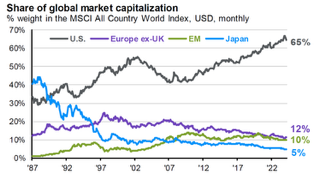 To se projevilo ve zmíněné výrazné nadvýkonnosti trhu USA nad zbytkem světa. Vždyť v uplynulých 15letech dosáhlo zhodnocení indexu S&P 500 včetně dividend 13,2 % p.a., zatímco zbytek světa přinesl výnos pouhých 5,4 % p.a. To způsobilo nárůst dominance amerických akcií v rámci světové tržní kapitalizace na úkor ostatních regionů, zejména Evropy a Japonska.
